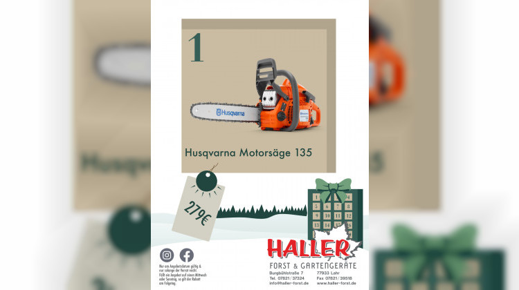 Türchen 1 bringt die Husqvarna Motorsäge 135. Ideal für Brennholz und Arbeiten rund ums Grundstück. Leicht, kraftvoll und zuverlässig. Heute für 279 Euro bei Haller Forst und Gartengeräte. Solange verfügbar.