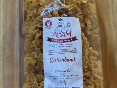 Sie erhalten handgemachte Bandnudeln mit gewellter Form und hohem Eianteil. Die Nudeln kochen in acht bis zehn Minuten und bleiben dabei bissfest.