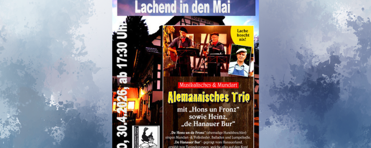 Ab 17:30 Uhr gibt es Geselligkeit und badisches Vesper im Holzwurm. Ab 19:00 Uhr spielen Hans und Franz Heimat- und Lumpeliedle sowie Oldies zum Mitsingen, Heinz Wendling bringt Mundart-Geschichten, Späszle und Gags.