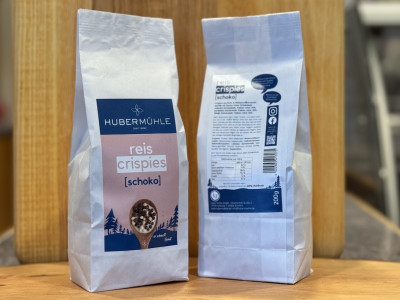 Die Crispies der Hubermühle bieten leichte Süße und schokoladigen Geschmack. Ideal für Müsli, Joghurt oder zum Backen.