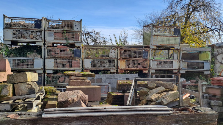 Im Lager findest du vor allem roten Sandstein in vielen Varianten und Maßen. Granit und weitere Steine liegen ebenfalls bereit.