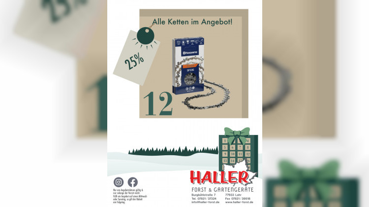 Alle Ketten im Angebot. Perfekt für den Winterdienst und deine Sägearbeit. Heute 25 Prozent Rabatt bei Haller Forst und Gartengeräte. Solange verfügbar.
