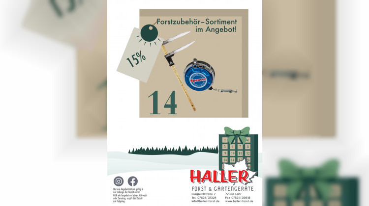 Großes Forstzubehör Sortiment im Angebot. Praktisch für Waldarbeit und Holzernte. Heute 15 Prozent Rabatt bei Haller Forst und Gartengeräte. Solange verfügbar.