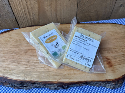 Der Bärlauchkäse vom Ramsteiner Hof ist ein halbfester Käse. Er schmeckt mild-würzig, hat eine Bärlauchnote und Rohmilcharoma im Geschmack. Ideal zu Brot, auf einer Käseplatte und zum Schmelzen.